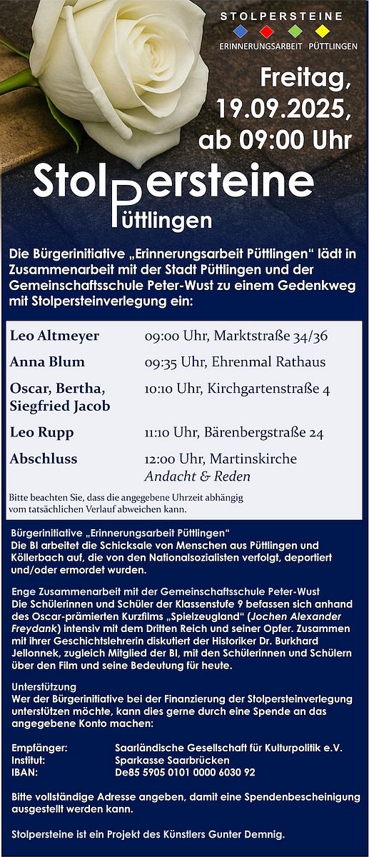 Beginn und erstes Gedenken: 9.00 Uhr in Püttlingen, Marktstraße 34/36
